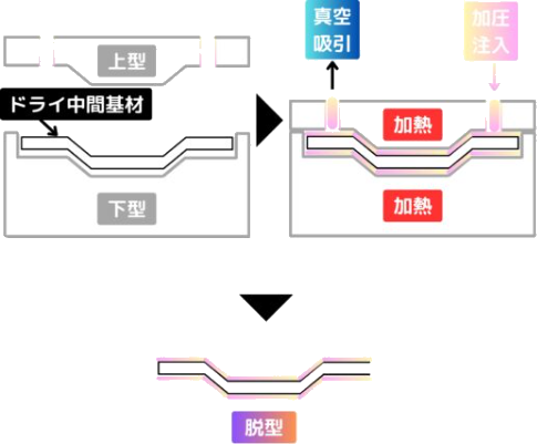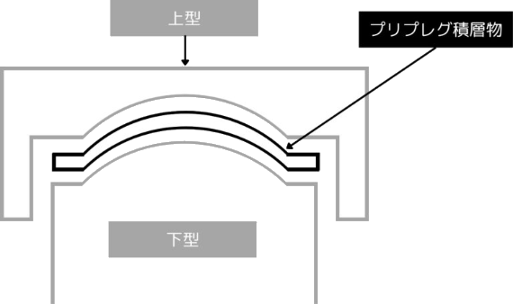 プレス成型は金型の圧力のみで、樹脂含侵中間基材(プリプレグやSMC)に含まれる樹脂を流動させるため、板形状の成形がメインとなります。