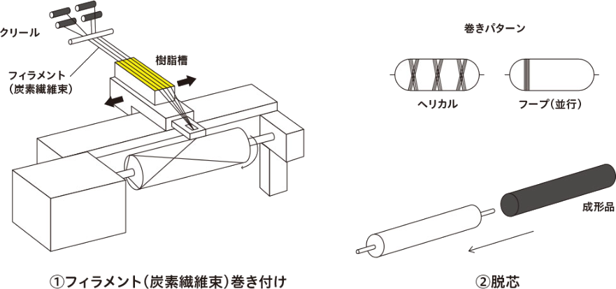 フィラメントワインディング法は中間基材を用いず、炭素繊維そのものを使用する成型法です。