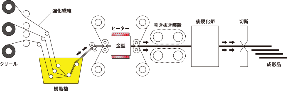 プルトージョン(引き抜き)法は中間基材を用いず、炭素繊維そのものを使用する成型法です。